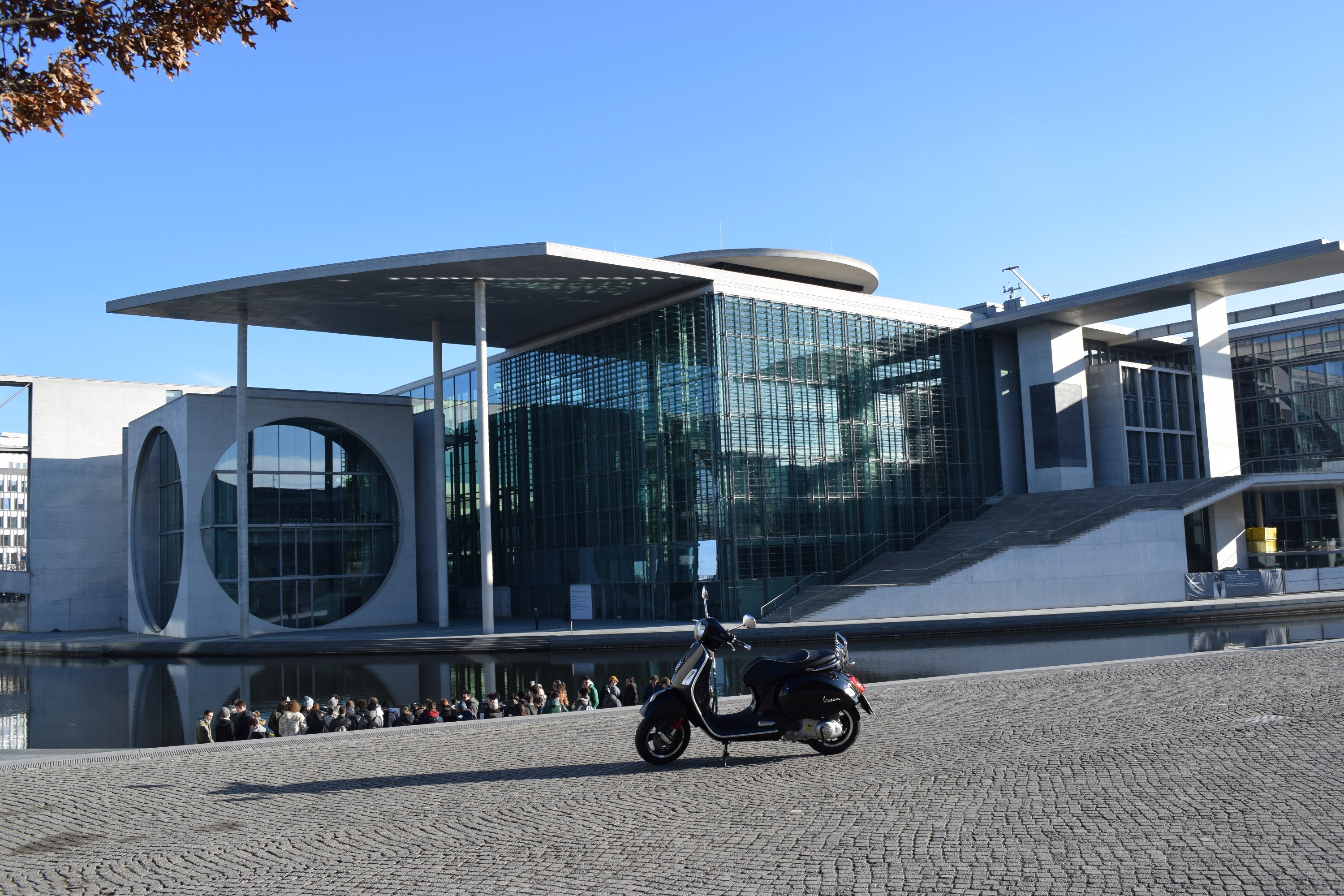 Berlin, Regierungsviertel, im Hintergrund Spree und Marie-Elisabeth-Lüders-Haus - Vespa GTS 300