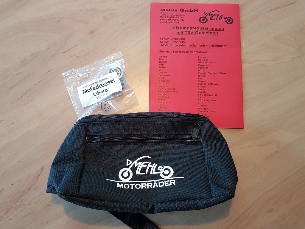 Der Satz besteht aus den zu verbauenden Teilen (Drosselring für die Vario, Vergaseranschlag und Scheibe für den Auslass), dem Gutachten mit Einbauanleitung für die Abnahme beim TÜV und einer Tasche zum Versperren des zweiten Sitzplatzes. Er ist vollständig. Es sind keine elektronischen Teile dabei und müssen auch nicht verbaut werden. Die Drosselung erfolgt rein mechanisch.