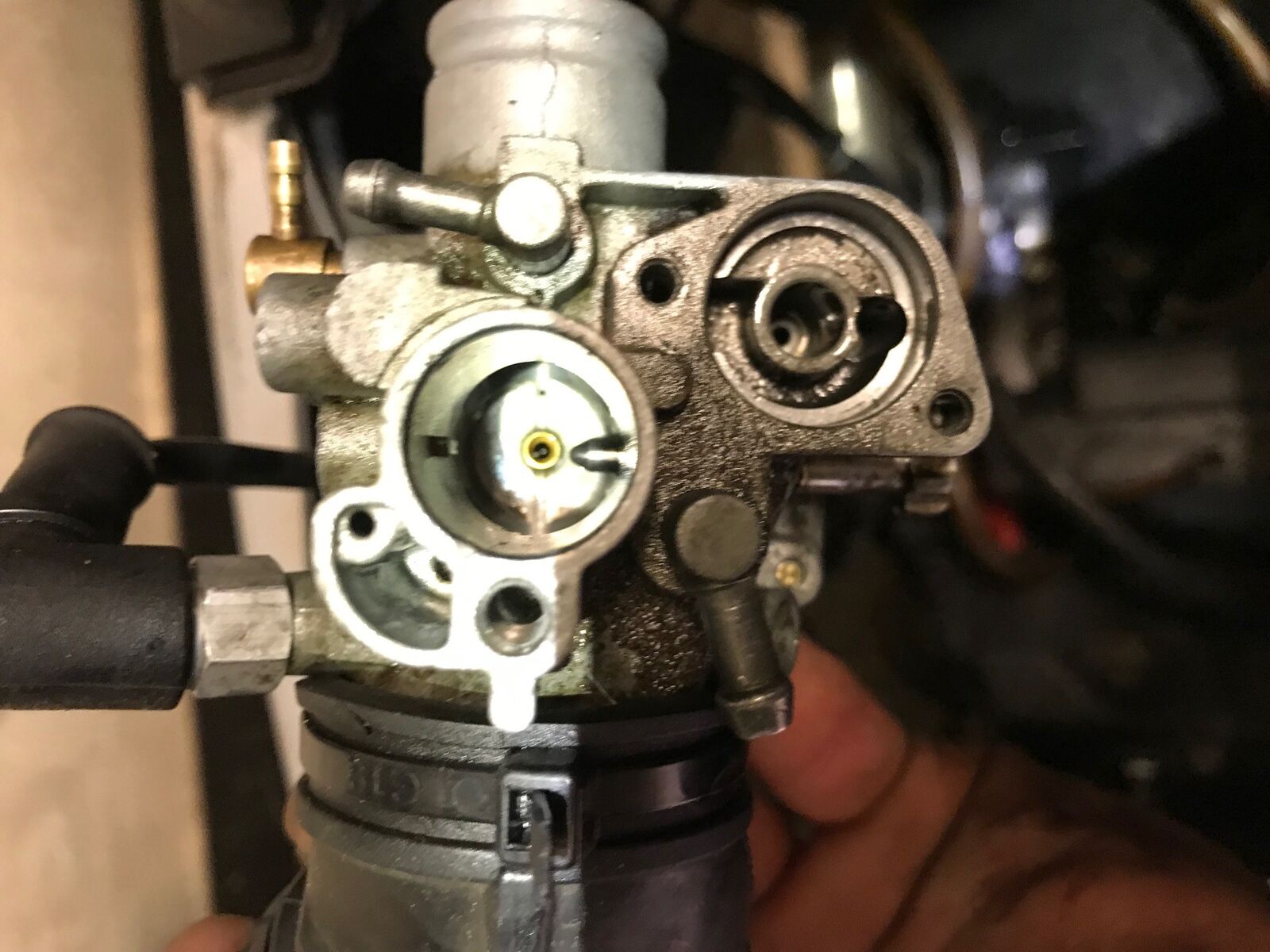 Nun der Ausbau war eigentlich sehr einfach, bis auf den Moment, dass mir eine Nadel von irgendwo heruntergefallen ist, bei der ich nicht sehen konnte, von wo das war. Ich habe es dann in das Messingrohr vom Vergaser reingesteckt und alles wieder eingebaut, aber ich bekam den Vergaser einfach nicht mehr dich, alles an Benzin lief ohne Ende runter.