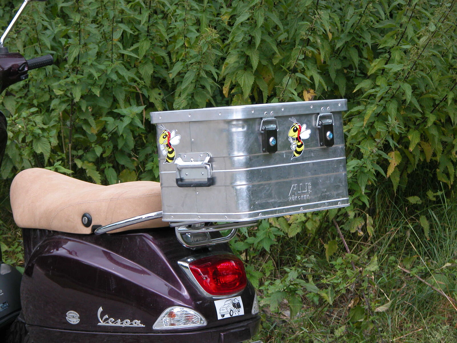 Meine Lösung ist eine Alubox, die nur bei Bedarf in zwei bis drei Minuten bestmöglichst diebstahls- und verkehrssicher am Klappträger angeschraubt werden kann. Seit die Wespenaufkleber drauf sind gefällt sie mir richtig gut.