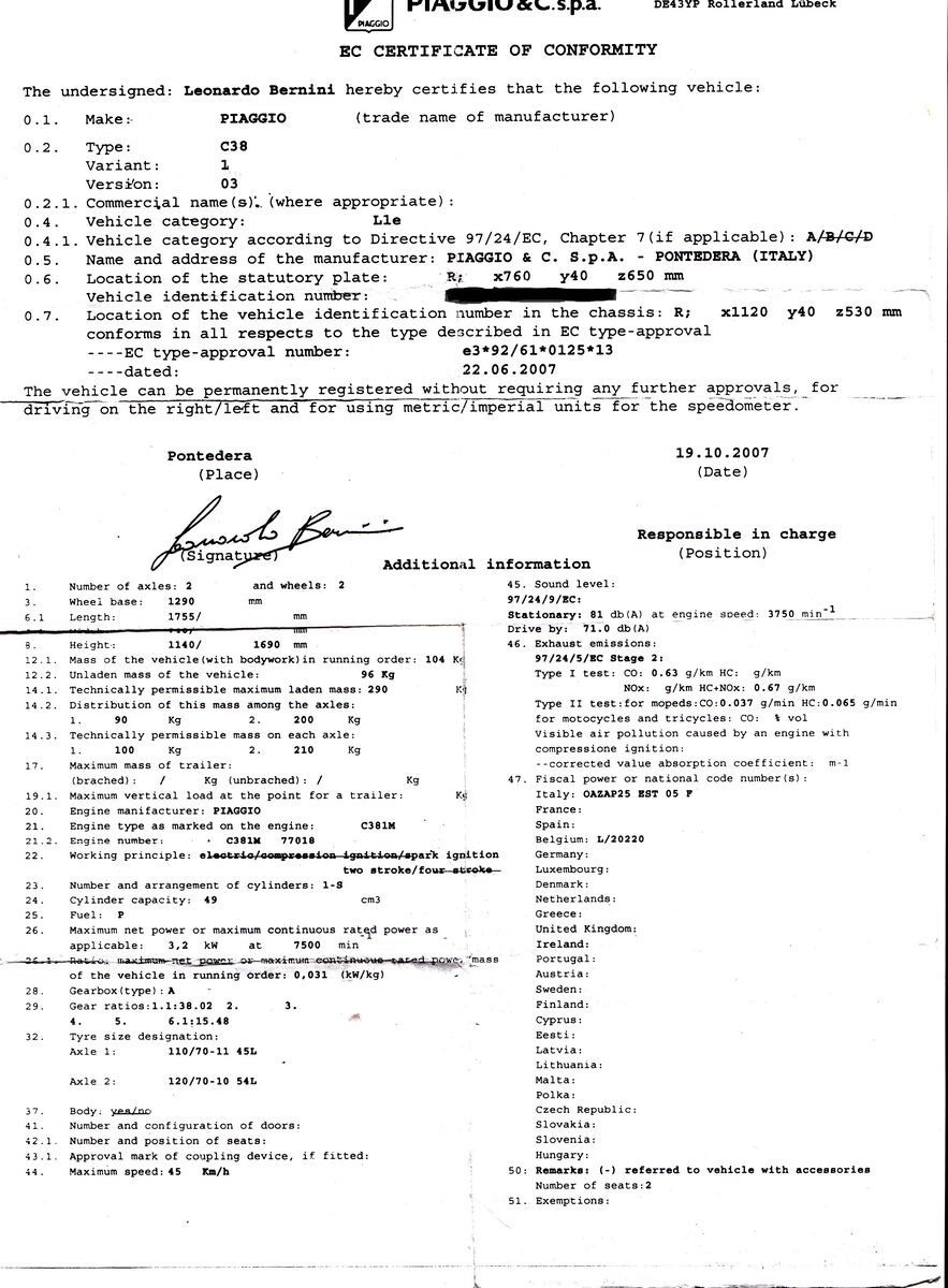 Papiere brauchst du entweder eine Betriebserlaubnis oder bei den neueren Modellen eine Konformitätserklärung. Beides sollte der Tüv oder Piaggio ausgestellt haben.