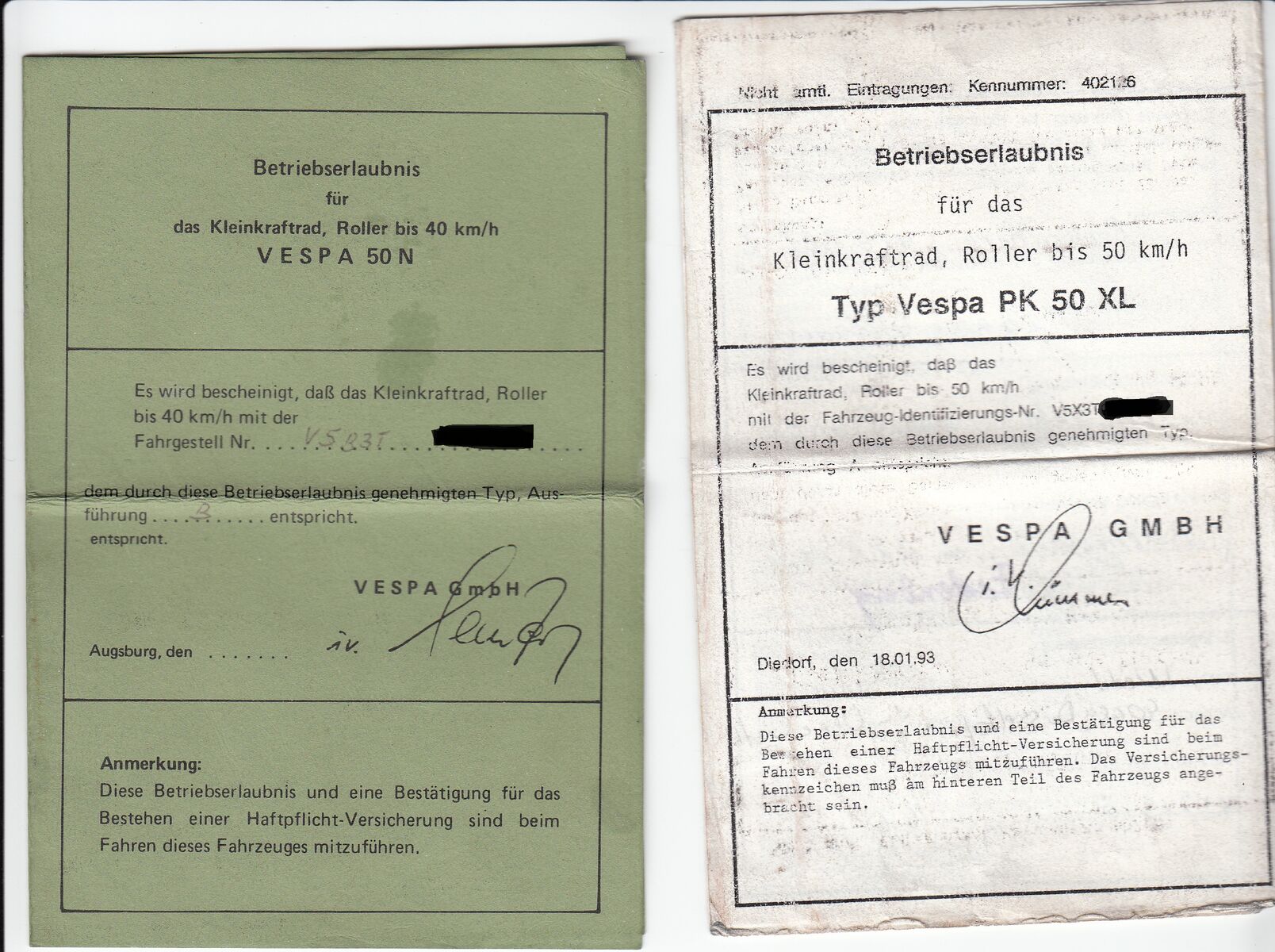 ich wuesste gerne was man so alles fuer Paiere fuer eine Vespa 50 ccm haben muss. Fahrzeugschein und brief wie beim auto? Mopedkarte, weiss ich. Was sonst noch?