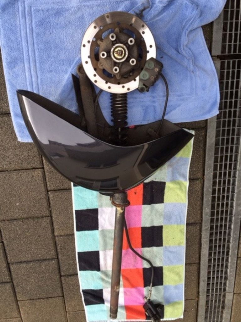 Vespa Gabel komplett für GT 125 Bj. 2006, mit Lenker mit Lenkergewichten li. u. re. hydraulischer Bremse, Bremszange Bremsscheibe, mit Druckgeber und Leitung und Kotflügel, u. Schwingenabdeckung u. Finne links. Auch Einzelteile zu verkaufen Preis auf Anfrage + Versand (nur bei Komplettgabel, bevorzugte Selbstabholung. Keine Garantie oder Gewährleistung keine Rücknahme. Preis 125 Euro. Privatverkauf.