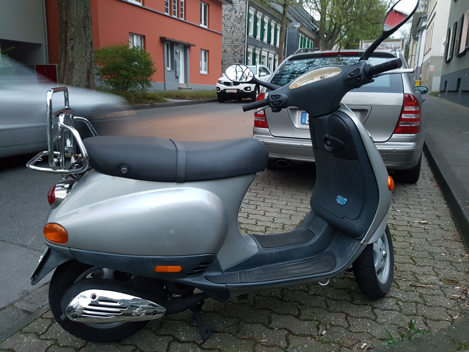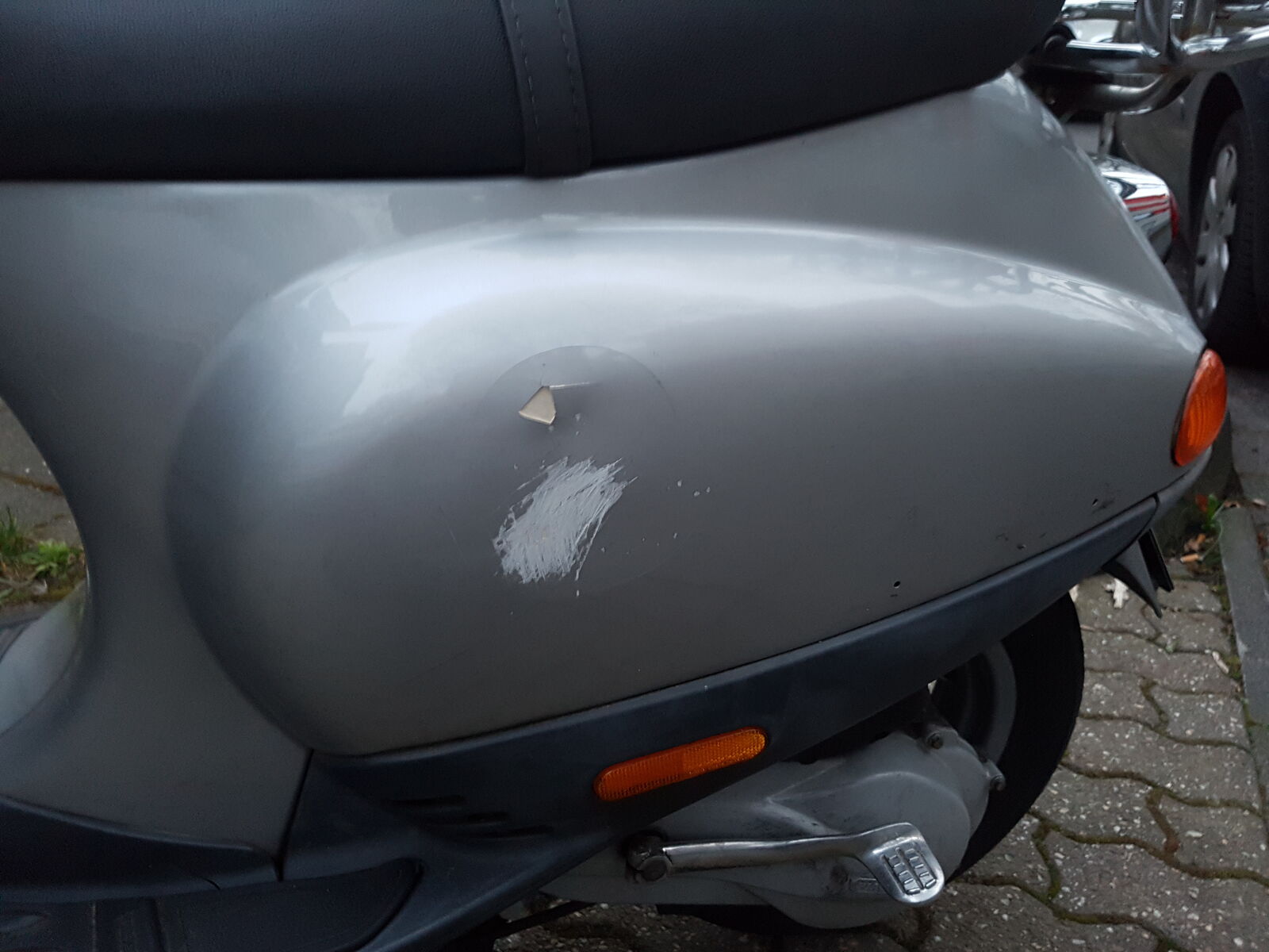Leider hat sie durch Stürze ein paar Kratzer und eine Beule im Blech. Die habe ich zwar schon ausgebeult, jedoch ist da bei der Lack gesplittert. Die Grosse Beule ist auf der linken Seite und auf der Rechten Seite sind noch Kratzer von der Vorbesitzerin. Vorne links sind auch noch Spuren zu sehen und der Kantenschutz und die Halteklammer sind auch sehr in mitleidenschaft gezogen worden.Ich habe mir auch schon das Service Buch zur Vespa geholt, jedoch lässt das noch einige Fragen offen