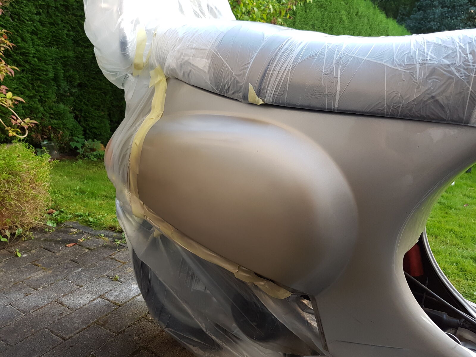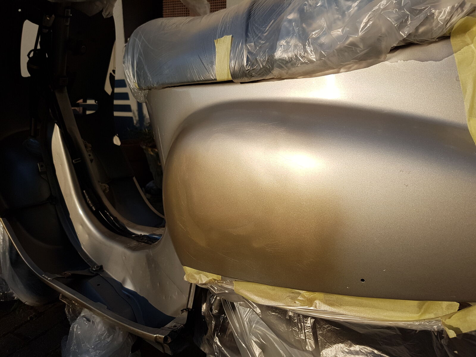 Leider bin ich längere Zeit nicht dazu gekommen am Roller zu arbeiten, aber habe mir jetzt die Zeit genommen und mehrere Tage gespachtelt und geschliffen bis es glatt war. Lackieren hat soweit geklappt, nur ist der Farbton der falsche