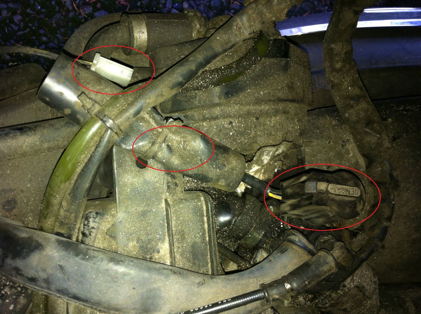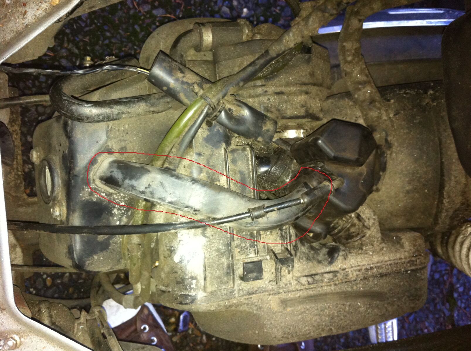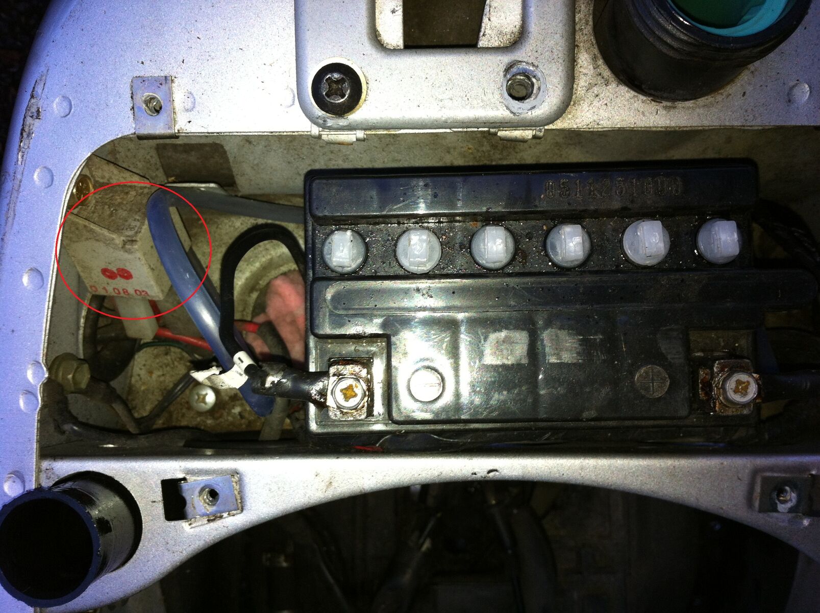 Ein Blick direkt unters Helmfach. Was ist das für eine Komponente? Warum ist der Stecker für das Teil nicht reingesteckt! (Der andere Stecker liegt in dem schwarzen Schlauch, rote Kreise) Könnte das der Grund sein? Das hat doch da alles mit dem Vergaser zu tun.