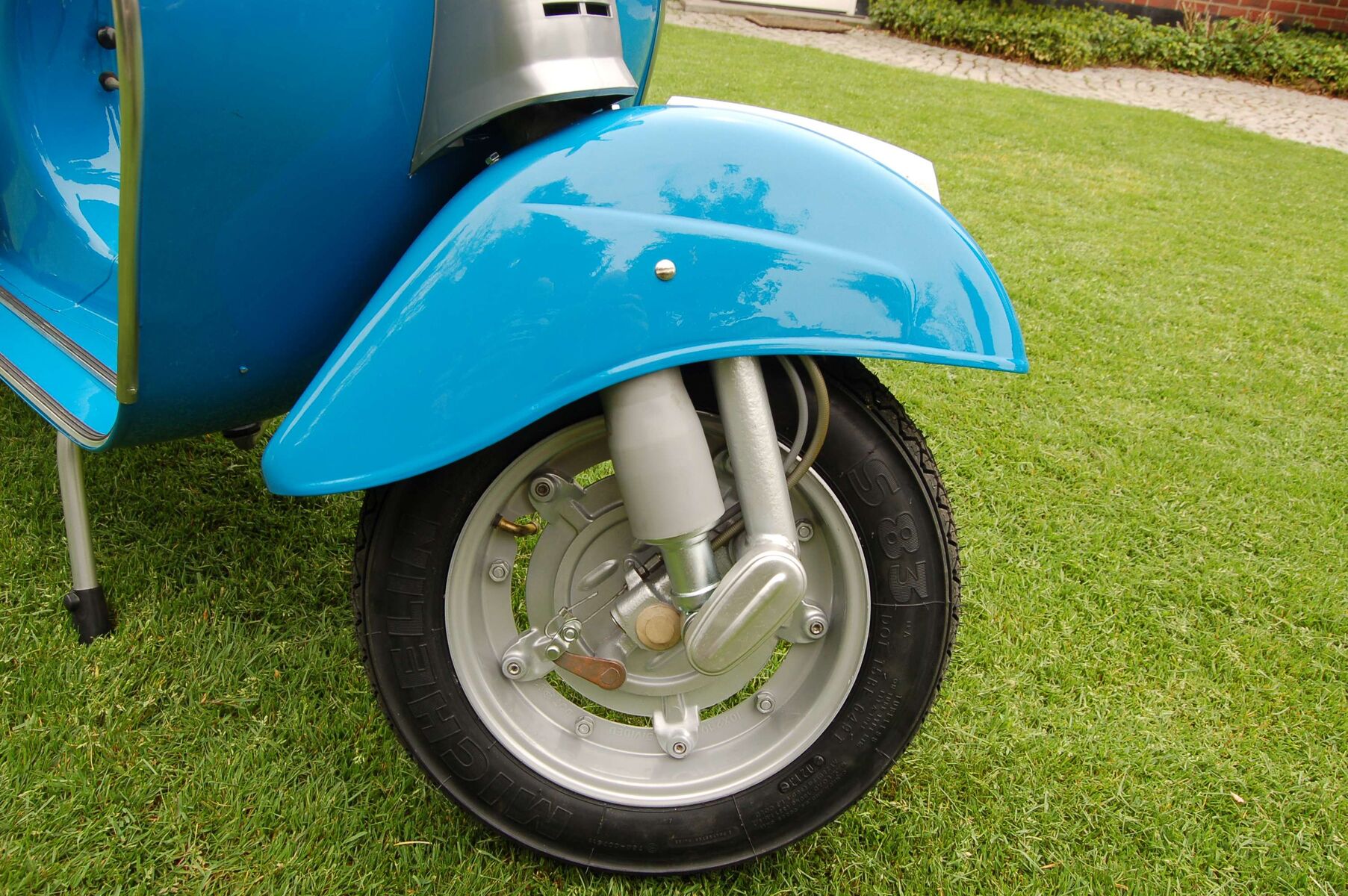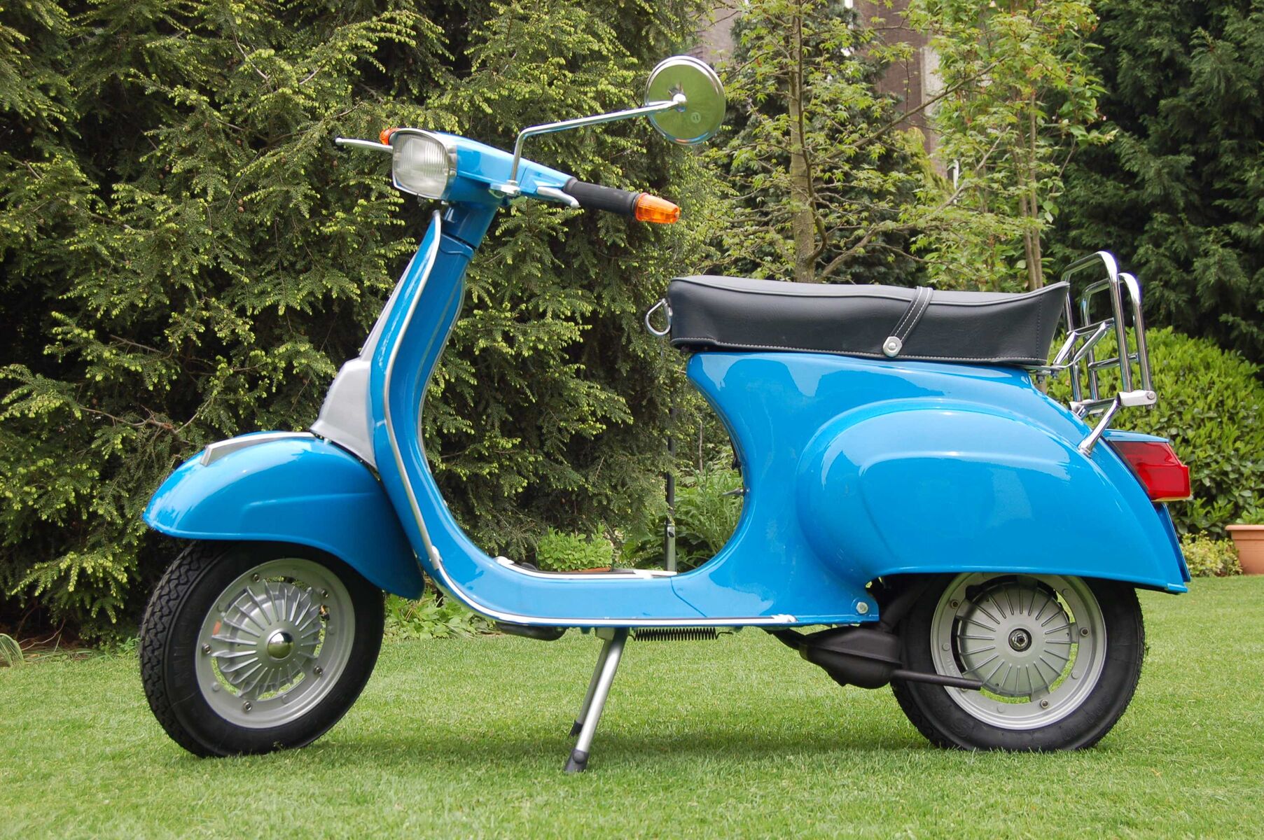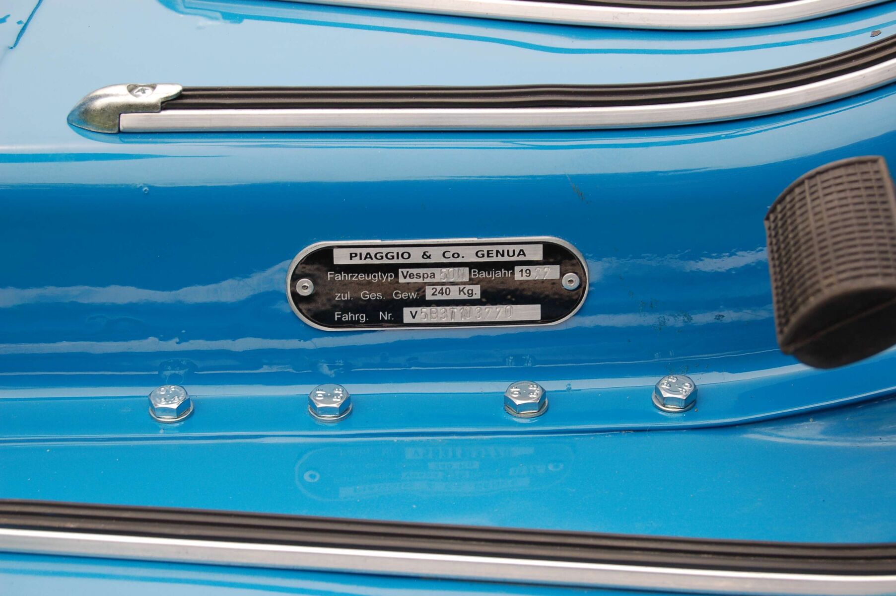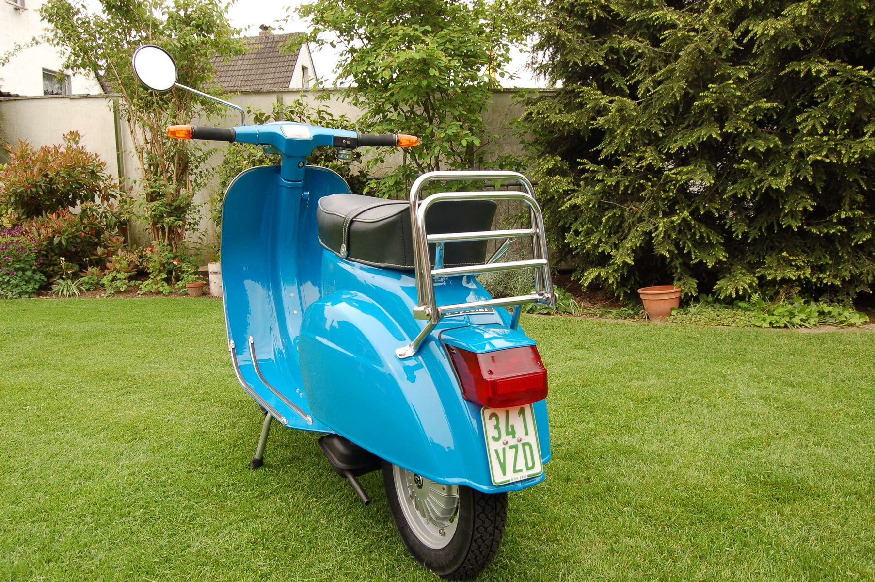 Die Farbe ist Azzurro Cina Nummer 402 (Blau China). Die bisherige Laufleistung, lt. Tacho 6400 Kilometer. Es wurden für ca. 800 Euro Neuteile eingebaut Erneuert wurden alle Gummiteile, die Bowdenzüge, Räder und Reifen, das vordere Federbein, die Trittleisten und das Kantenschutzrohr, die Bremsbeläge und die gesamte Verkabelung. Die Bank wurde neu bezogen. Die Vespa ist versichert und kann sofort gefahren werden.